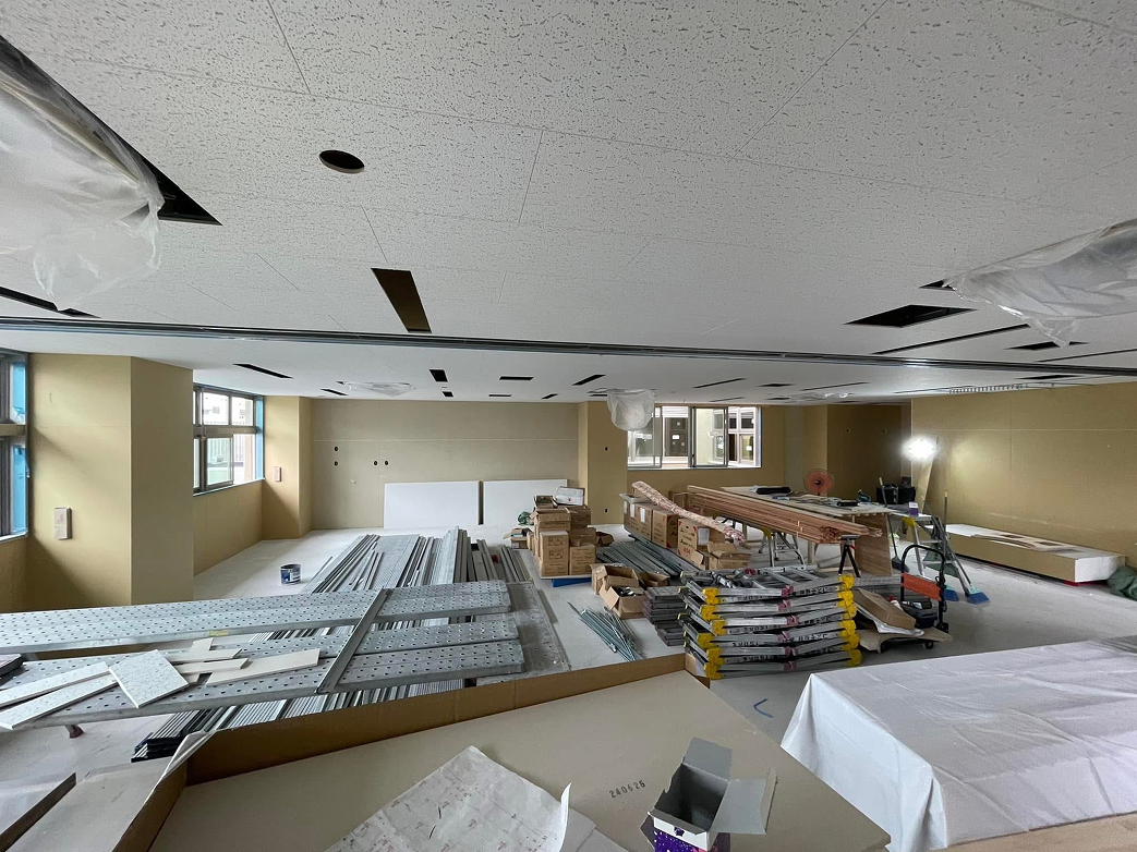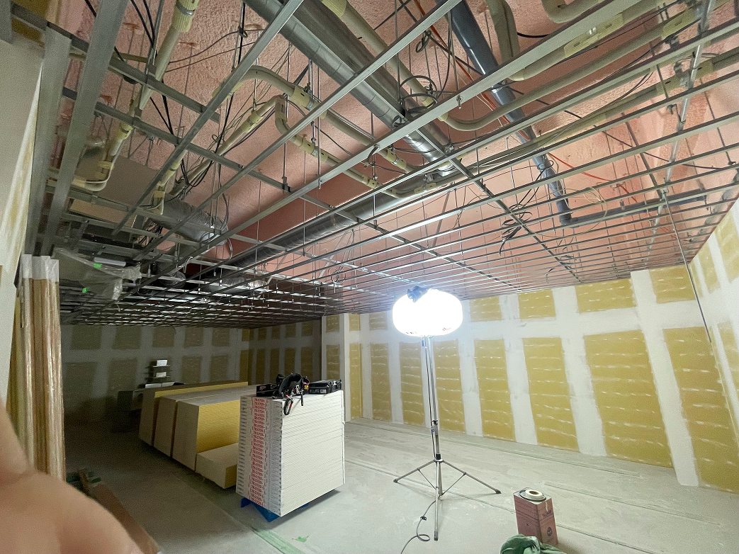 天井・壁の下地となる軽鉄材の組立やボード貼りなど、内装の基盤を作る工事です。